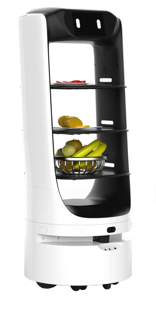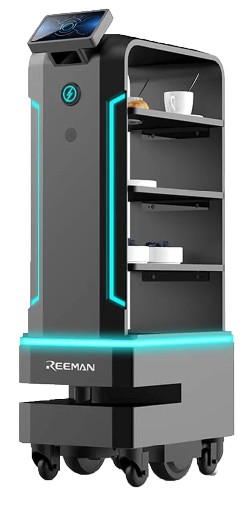 • Modo “eventos” para atrair clientes e divulgar promoções; • Modo “recycle” para recolher louça automaticamente; • Celebrações automáticas (“feliz aniversário”, etc.) via voz personalizada. - Integração vertical opcional — compatível com módulos de controle de elevador e portas automáticas, ideal para hotéis e ambientes multiandares.